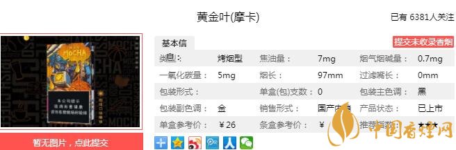 黃金葉摩卡煙支長97mm,煙嘴設計為暗金色,甜甜的有點像煊赫門,煙支拿在手上十分舒適。下面我們一起來看黃金葉摩卡的參數(shù)信息:焦油量:7mg 煙堿量:0.7mg 一氧化碳量:5mg