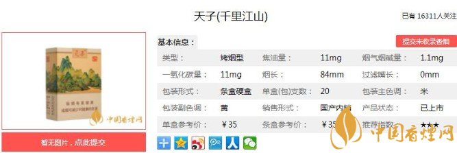天子(千里江山)以重慶武陵生態(tài)地區(qū)優(yōu)質(zhì)煙葉為原料,匯聚綜合降焦與減害技術(shù)等集成應(yīng)用,在降低有害氣體同時使煙氣更加清香雅致。下面便是天子(千里江山)的基本參數(shù):焦油量:11mg 煙堿量:1.1mg 一氧化碳量:11mg.
