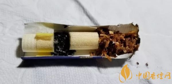 剖開濾嘴,連活性炭段,濾嘴是四段。最外側(cè)是一段中空硬化濾嘴,這個(gè)技術(shù)來(lái)源于BAT,目前國(guó)內(nèi)很多煙廠在其中高端款型上都有采用。從活性炭段前后的絲束段顏色來(lái)看,稍稍淺黃,顏色均勻,煙氣的流速和空氣導(dǎo)入效果不錯(cuò),活性炭的過(guò)濾和穩(wěn)流作用不錯(cuò)。