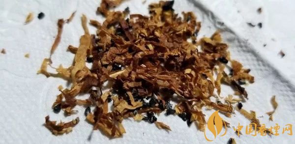 攤開煙絲,外觀金黃油潤(rùn)。淺黃切寬略寬的為涂布制絲,其余為棕黃的原片煙絲,中間有切得極細(xì)小揉捻得很柔軟的煙梗。用料是比較實(shí)在的了。