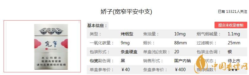 做為寬窄系列家族新成員,嬌子(寬窄平安中支)也已登臺(tái)亮相。在寬版粗支、細(xì)支、短支等測(cè)試版本之后,最終推出了中支版本的平安,并在2018年驚艷上市。味道傳承了寬窄系列的細(xì)膩典雅,又有其自身的溫潤(rùn)柔媚,是一款質(zhì)高價(jià)美的卷煙產(chǎn)品。經(jīng)小編市場(chǎng)調(diào)查嬌子(寬窄平安中支)售價(jià)為40元/包。