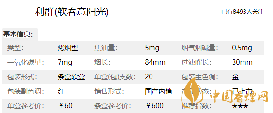 利群(軟春意陽光)采用國內頂級的降焦技術,配以一級香煙原料精心調制而成。它是國內低烤香煙中的經典高端之作。它的焦含量僅為5mg,香煙品質卓越,煙香飄逸,口感醇香怡人,深受高端消費群體的青睞。據小編調查得知市場售價為60元/包。