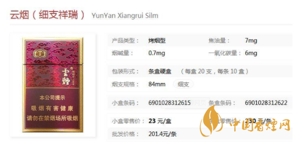 云煙祥瑞細(xì)支香煙價(jià)格表圖