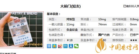 大前門煙標(biāo)CHIENMEN是中國的著名品牌,大前門原名為CHIENMEN(即指北京前門),已奇跡般地走過了100多年的歷程。從煙標(biāo)的歷史看,一種商標(biāo)能經(jīng)歷50年者已屬少見,其影響力不言而喻,那么我在分析大前門短支香煙價格表之前,先來看看這款短支大前門多少錢一包,它的售價為18元/包。