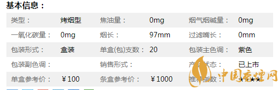 | 煙長:97mm | 過濾嘴長:25mm | 包裝形式:條盒硬盒細(xì)支 | 單盒(包)支數(shù):20 |