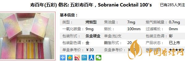 Sobranie譯為壽百年,為日本煙草公司所屬英國加萊赫公司產(chǎn)品,作為一個主要消費對象是女性的香煙品牌,這款壽百年(五彩),也是表現(xiàn)的非常好,那么在對五彩壽百年香煙價格表進(jìn)行一個詳細(xì)的分析之前,先來看一看五彩壽百年多少錢一包,它的零售價為30元/包。