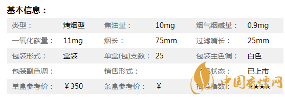 | 煙長:84mm | 過濾嘴長:25mm | 包裝形式:條盒硬盒 | 單盒(包)支數(shù):20 |