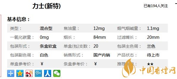 類型 :混合型 焦油量 :12mg 煙氣煙堿量 :1.1mg 一氧化碳量 :13mg