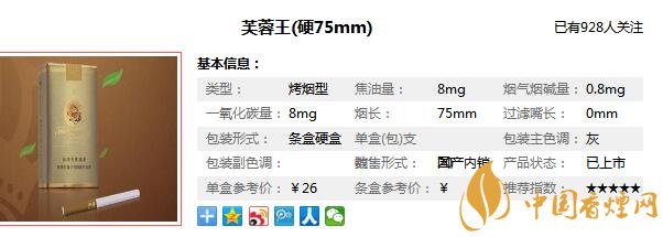 芙蓉王香煙于1994年誕生,參與中國(guó)高檔卷煙市場(chǎng)競(jìng)爭(zhēng),意在搶奪20元檔以上這一當(dāng)時(shí)的價(jià)位市場(chǎng)空白點(diǎn),然而芙蓉王香煙做的非常成功,它的風(fēng)格深受廣大卷煙消費(fèi)者喜愛(ài),更因其內(nèi)在品質(zhì)被譽(yù)為“中式卷煙的典范代表”。在對(duì)新出短支黃芙蓉王售價(jià)進(jìn)行分析之前,先來(lái)看看這款芙蓉王短支多少錢(qián)一包,這款香煙叫做芙蓉王(硬75mm)售價(jià)為26元/包。