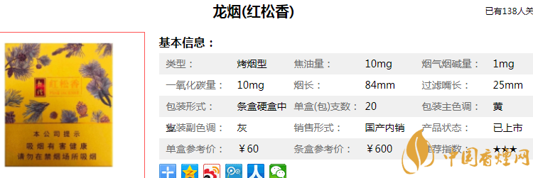 獨特的紅松香爆珠口味十分罕見,龍煙(紅松香)2017年中國喜慶產(chǎn)業(yè)十大領袖品牌,抽下來煙友表示優(yōu)點淡,適合新手。