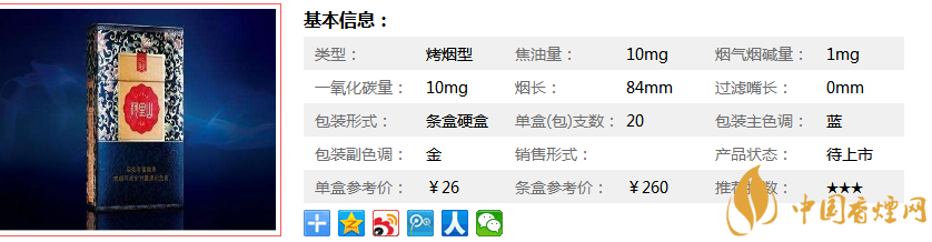 | 煙長:84mm | 過濾嘴長:25mm | 包裝形式:盒裝 | 單盒(包)支數(shù):20 |