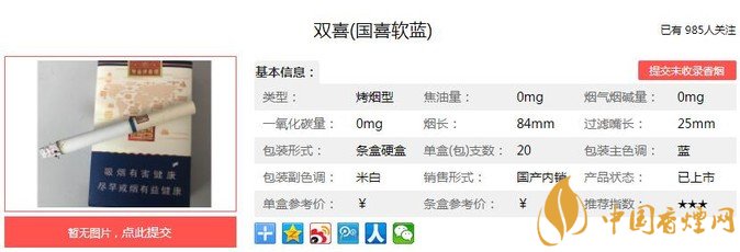 雙喜國喜軟藍煙支長84mm,過濾嘴長:25mm,因為這款是“非賣品”,所以全部為“0”的理化指標,當(dāng)然這不可能是“0”焦油的,是廠家沒有標注具體的理化指標而已。