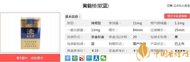 黃鶴樓軟藍(lán)煙支長(zhǎng)84mm,過(guò)濾嘴長(zhǎng)25mm,獨(dú)特加長(zhǎng)煙棒有效過(guò)濾煙氣中有害物質(zhì),對(duì)人體危害更小,吸食更安全。下面我們一起來(lái)看黃鶴樓軟藍(lán)的參數(shù)信息:焦油量:11mg 煙堿量:1.1mg 一氧化碳量:13mg