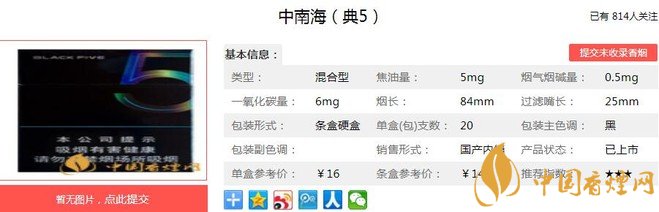 中南海卷煙最早為北京卷煙廠生產的特供煙,1976年中對外試銷,由此進入市場。1983年新混合型中南海卷煙誕生,1994年低焦油中南海成功研制,1999年后至今,中南海5mg、中南海8mg、中南海金8mg、中南海典5等產品問世,形成了混合型中南海系列產品。下面就由香煙網小編帶大家一起來了解中南海典5的相關信息。