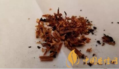 煙絲從外觀上檢視,由棕黃和明黃煙絲組成,品級不錯(cuò)。煙絲切寬1mm左右。間雜切成細(xì)小圓片裝的煙梗。用料還是比較考究的。