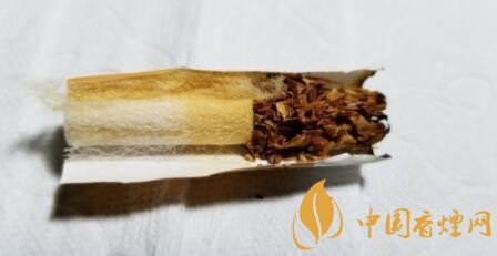 剖開濾嘴,降焦孔開在了一段式絲束的前1/3段。由于煙氣量充裕的關(guān)系,前段絲束顏色較深一些,后段淡黃,總體顏色變化均勻一致,空氣的導入效果明顯。