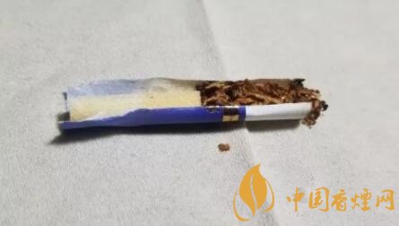 剖開(kāi)濾嘴,絲束長(zhǎng)度并不長(zhǎng),14mm左右。降焦孔正好在絲束的中部位置。水松紙內(nèi)部還襯有一層類似綿紙的細(xì)軟質(zhì)層。絲束的顏色比較淺,前段稍稍變黃一些。整段顏色均勻。