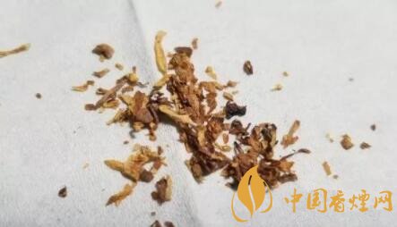 攤開(kāi)煙絲,主要以明黃、棕黃的原片切絲為主,夾雜有切得極薄的煙梗。用料當(dāng)屬用心和上選。