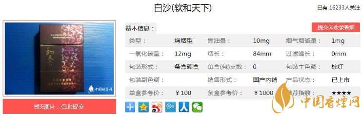 “白沙(軟和天下)在吸味、香氣與刺激性上的協(xié)調(diào)完美;煙嘴仍然采用了圓形鏤空煙嘴,長(zhǎng)度37mm,樣式與硬和也是基本一樣,只是多出來(lái)一道金環(huán)。基本參數(shù)如下:焦油量:10mg