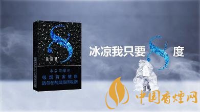 此款雙爆包裝和8度單爆基本是一樣的設(shè)計(jì),只是在8字圓環(huán)處采用了藍(lán)綠2種配色,兩片綠葉襯托著一顆冰珠,并釋放微光,表述這款香煙是兩種口味的爆珠。