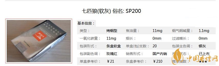 七匹狼軟灰亦稱七匹狼(SP200),精選國(guó)內(nèi)外優(yōu)質(zhì)烤煙,人工片選精華,運(yùn)用國(guó)際先進(jìn)的無(wú)氟及過(guò)濾技術(shù)、HXD烘絲工藝,由全新的國(guó)際一流廠房和設(shè)備精工制作,氣質(zhì)卓越優(yōu)雅,品味自然純正,煙草本香流露無(wú)遺,是比較經(jīng)典的具有較高性價(jià)比的狼煙。經(jīng)香煙網(wǎng)小編市場(chǎng)調(diào)查七匹狼軟灰售價(jià)為21元/包。