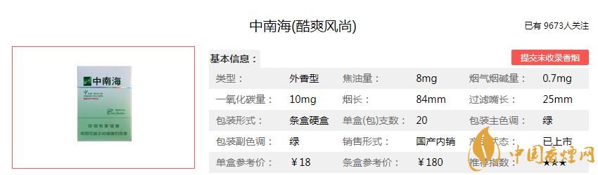 中南海酷爽風尚是混合型香煙中的極品,自然清新的茶香,勁涼的薄荷味非常突出,很多煙客對它特別的青睞。