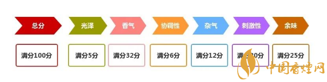 煙草行業(yè)對(duì)于成品卷煙明確的評(píng)價(jià)標(biāo)準(zhǔn)是百分制的感官評(píng)吸國標(biāo)賦值法打分,質(zhì)量評(píng)價(jià)指標(biāo)由光澤、香氣、雜氣、刺激性、余味、協(xié)調(diào)6項(xiàng)指標(biāo)組成,根據(jù)眼觀手觸吸食掌握的性狀打分,分值越高代表其品質(zhì)越好。