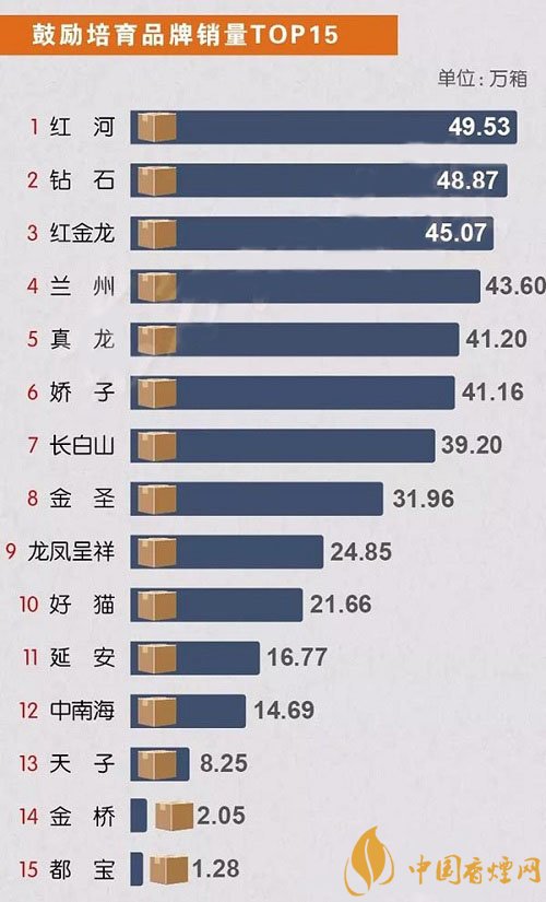 鼓勵培育香煙品牌銷量中,紅河香煙居第一位,年輕品牌鉆石香煙以微弱差距屈居第二,第三名紅金龍緊隨其后。蘭州、真龍、嬌子、長白山、金圣、龍鳳呈祥、好貓、延安、中南海、天子、金橋、都寶分別為4-15名。