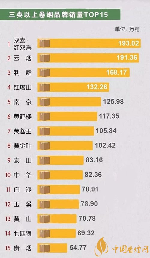 三類以上卷煙品牌銷量中,百年香煙品牌雙喜紅雙喜以微弱的優(yōu)勢位居榜首,云煙緊隨其后與排名第三的利群拉開差距。紅塔山、南京、黃鶴樓、芙蓉王、黃金葉分別位居4-8位,銷量也維持在一百萬箱以上,泰山、中華、白沙、玉溪、黃山、七匹狼、貴煙雖然銷量在一百萬箱一下,但都榜上有名,分別占據(jù)9-15位。一直以來,三類卷煙作為全國卷煙市場的中堅力量,其市場份額之高、覆蓋面之廣、影響力之深,始終備受行業(yè)內(nèi)外的關(guān)注。
