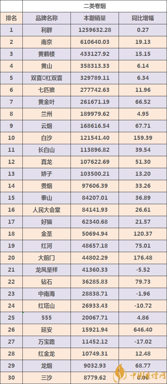 在二類煙品牌銷量的TOP30中,我們看到了品牌之間此消彼長的競爭態(tài)勢,不過從總體來看,這一價位區(qū)間的總體呈現(xiàn)擴容態(tài)勢。利群品牌依然保持著在二類煙市場上的頭號優(yōu)勢,縱然增幅不高,但是基數(shù)龐大,哪怕0.1%的增長也是不小的成績。