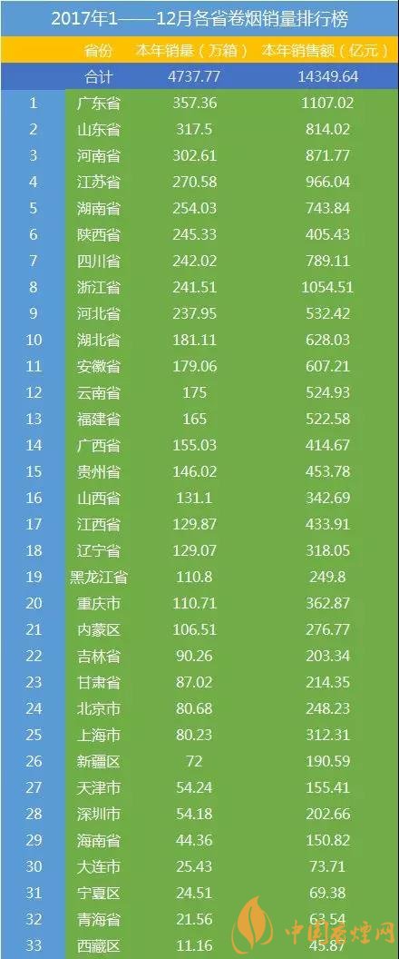 轉(zhuǎn)眼2018已經(jīng)到來(lái),上次小編寫(xiě)到2017年商業(yè)品牌銷(xiāo)量的前15名,今天就來(lái)和大家說(shuō)說(shuō)各地卷煙銷(xiāo)量情況。在剛剛過(guò)去的2017這一年里,你為家鄉(xiāng)卷煙銷(xiāo)量都貢獻(xiàn)了多少呢?最新中國(guó)香煙銷(xiāo)量排行榜前10名出爐!下面香煙網(wǎng)小編為大家整理介紹。