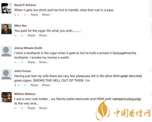 5、 William Wallace:我用玉米棒來裝抽到很短的雪茄,這個方法可以讓我的蒙特小艾蒙多和HDM小羅布圖抽到非常非常短的程度……