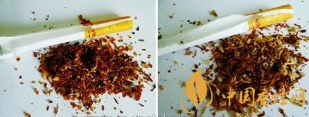 真品煙絲摻配均勻,煙絲顏色呈現(xiàn)出金黃色,油潤(rùn)性好,含煙末少;假煙煙絲劣質(zhì),煙絲顏色為淡黃色,煙絲摻雜質(zhì)多,煙梗煙末多,與真品煙絲結(jié)構(gòu)存在明顯差異。