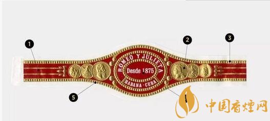 3. 白色字樣:之前的茄標上曾印有這樣一句話:“Rodriguez, Argüelles y Cia”,但現(xiàn)在的茄標上則印有品牌名ROMEO Y JULIETA、品牌創(chuàng)立年份Desde 1875和產(chǎn)地HABANA·CUBA。