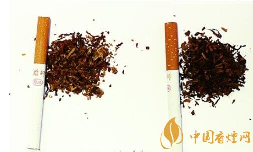 真煙煙支過濾嘴長度為25mm,煙絲切絲寬度均勻,顏色呈橘黃色,摻配有少量膨脹葉絲、膨脹梗絲和造紙法再造煙葉;假煙煙支過濾嘴較短,長度約為20mm,制絲工藝粗糙,顏色呈暗褐色,大量梗絲未經(jīng)過膨脹處理,一般無膨脹葉絲和造紙法再造煙葉,與真品特征存在明顯差異。