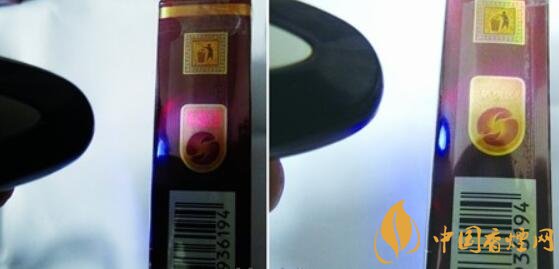 真品小盒在驗(yàn)鈔燈的照射下,防偽區(qū)立刻呈現(xiàn)出紅色“豐和”兩個(gè)字,關(guān)閉驗(yàn)鈔燈又能復(fù)原防偽區(qū);假煙在驗(yàn)鈔燈的照射下,防偽區(qū)無(wú)任何變化,與真品存在明顯差異。