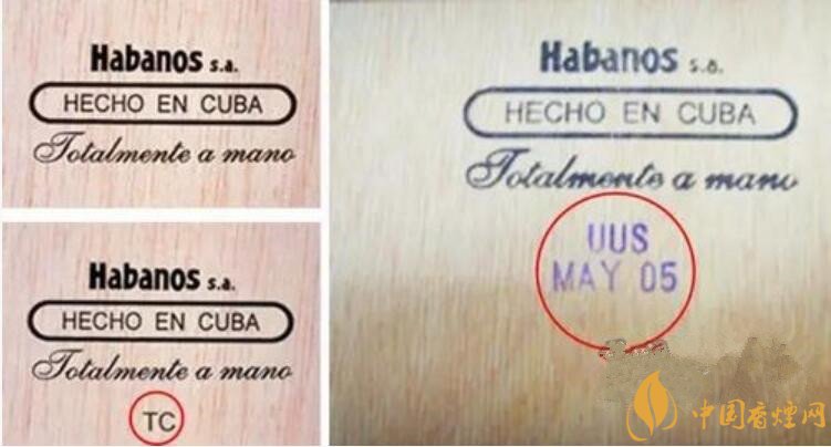 細(xì)心的你還會(huì)注意到在紙盒或木盒的底部,有一個(gè)郵戳一樣的東西。這個(gè)簡易的郵戳是這盒雪茄的工廠代碼和生產(chǎn)日期,UUS是工廠代碼,MAY 05 則表示是2005年5月。