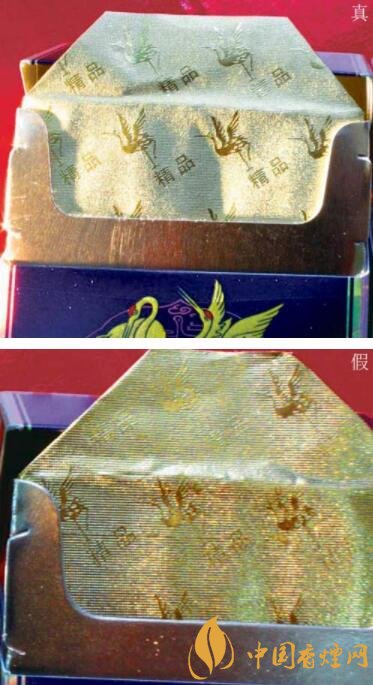 真煙內(nèi)襯紙上鶴的圖案和“精品”二字清晰、立體;假煙內(nèi)襯紙上的圖案和字則模糊不清。