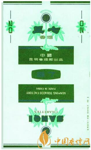 1983年昆明卷煙廠出品。主、副圖為綠色三七植株,商標(biāo)簡捷、具像,主題醒目。三七為云南省著名且地道的中藥材特產(chǎn),盛產(chǎn)于滇東文山州地區(qū),其歷史悠久、產(chǎn)量大、質(zhì)量好,習(xí)稱“文三七”、“田七”。