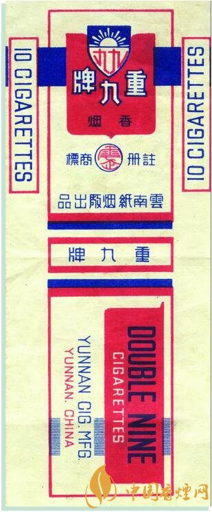 1945年,云南紙煙廠出品。創(chuàng)牌于1922年,為紀念護國名將蔡鍔等所領(lǐng)導(dǎo)的“重九起義”而創(chuàng)牌,重九牌歷史悠久,具有豐富的文化內(nèi)涵,是云南紙煙廠的榮譽產(chǎn)品。該牌號卷煙僅生產(chǎn)13.85箱,屬罕見珍貴煙標(biāo),具有歷史文物價值。1945年6月1日云南紙煙廠在昆明金碧日報刊登“重九”牌更換商標(biāo)紙盒啟示 , 以此啟示為證改寫了此枚珍貴歷史商標(biāo)的確切生產(chǎn)時間。