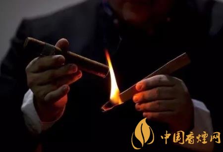 雪茄煙翻開(kāi)一端(尾部)是點(diǎn)著的一端,不要將尾部直接放在火焰上,也不要先將雪茄放在嘴里。應(yīng)當(dāng)先用手拿住雪茄,將尾部以45°角接近火源一英寸處,這么做的意圖是為了預(yù)熱或是將煙灸熱以保證雪茄能充沛、均勻的點(diǎn)著。在灸燒時(shí)旋轉(zhuǎn)一下雪茄,當(dāng)雪茄煙尾部已均勻加熱,變得焦黑和發(fā)亮?xí)r,將雪茄置入口中。