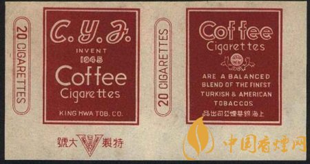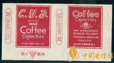 這張煙標(biāo)在白底色上做文章,正標(biāo)上是深赭色長(zhǎng)方框,正標(biāo)兩旁印有兩個(gè)紅雙線(xiàn)兩端弧形的長(zhǎng)方框,內(nèi)寫(xiě)有紅色“20 CIGARETTES”,即為20支一包的卷煙規(guī)格。副標(biāo)印有咖啡的英文單詞,其下一個(gè)向上半開(kāi)的花邊圓弧框內(nèi)有個(gè)白色圓圈,圈內(nèi)是豎寫(xiě)的中文字“咖啡”,字體很小,不仔細(xì)看難免忽略。副標(biāo)下半部分則有一段全英文產(chǎn)品介紹“ARE A BALANCED BLEND THE FINEST TURKISH & AMERICAN TOBACCO”,譯為“該產(chǎn)品平和摻入了一流的土耳其和美國(guó)煙草。”底部為中文字“錦華煙廠出品”。“Coffee Cigarettes”英文字占據(jù)了整張煙標(biāo)的大部分空間,絕對(duì)奪人眼眸。