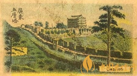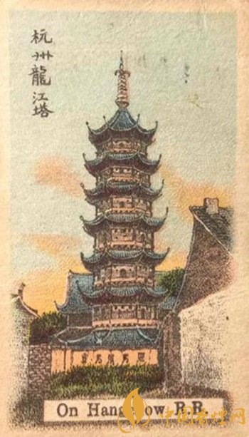浙江杭州龍江塔何時始建暫時無考,從畫面上可以看出是一座七級八面的精美古塔。可惜,現(xiàn)在這座古塔已蕩然無存,我們也只能從這張小小的煙畫上來領(lǐng)略這座古塔的風韻。