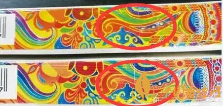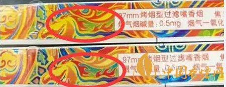 如下圖標(biāo)示,此處圖案真煙為藍(lán)色,假煙則變成了綠色;真煙的線條為黃色,假煙變成了紅色;真煙為綠色的圓珠外面為藍(lán)色的底色,假煙都變成了綠色。(上假下真)