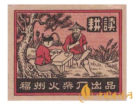 而福州火柴廠出品于1954年的“耕讀”(圖4)火花,則表現了一位頭戴斗笠的老農在春耕間隙,翹著二郎腿坐在田邊青松下的石頭上,胳膊肘斜放于在石桌,面帶微笑,抽著旱煙陪伴孫兒讀書的場景。再看老農身后的簍子,以及桌上的碗筷,似乎是描寫這個老農在吃完孫子給送的飯后,不忘“耕讀傳家”祖訓,利用吃飯休息間隙,輔導孫子多學點知識。