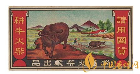 上世紀30年代,啟昌火柴廠出品的“耕牛”(圖1)火花,就描繪了一幅美麗的山村春耕圖:在數棵綠油油的樹木點綴下,幾戶農家散落分布于山腳前的農田里,一位頭戴斗笠的農夫正扶犁驅牛耕田,近處則是一頭碩大的水牛目視前方的形象。