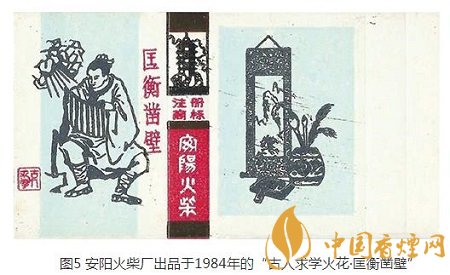 上世紀(jì)80年代,安陽火柴廠出品的“古人求學(xué)”火花,再現(xiàn)了部分古代學(xué)霸身處逆境、好學(xué)不倦的形象。這套火花主版為我國傳統(tǒng)文化中的文書工具,即“文房四寶”毛筆、硯臺、墨、紙,其中紙已經(jīng)畫成了一幅精美的山水國畫,裝裱后掛在墻上,以供觀賞。主版則分別描繪了車胤束螢、黃霸讀經(jīng)、劉恕忘食、孫敬懸梁、荀淑求教、買臣負(fù)薪、鄭王辭位苦讀等古代十二位著名的讀書典范代表。其中“匡衡鑿壁”(圖5)一枚,描繪了西漢匡衡鑿穿墻壁引鄰舍之燭光,手捧竹簡苦讀的形象。