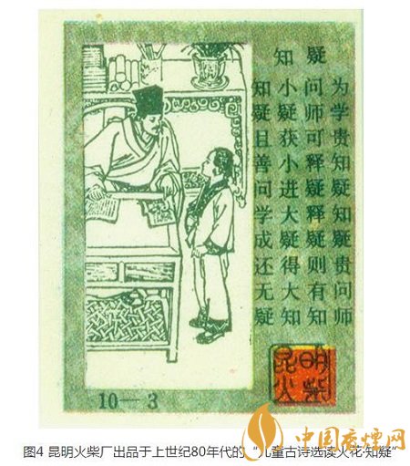 讀書學(xué)習(xí)貴在求教,一有疑問馬上向老師請教,以此獲得更大的進步。上世紀(jì)80年代,昆明火柴廠十枚/套的“兒童古詩選讀”火花中,“知疑”(圖4)就定格于一名學(xué)童在向一名私塾先生提出自己的疑問后,傾聽私塾先生給他講解。畫面旁邊還配印有古詩“為學(xué)貴知疑,知疑貴問師。小疑獲小進,大疑得大知。知疑且善問,學(xué)成還無疑”。