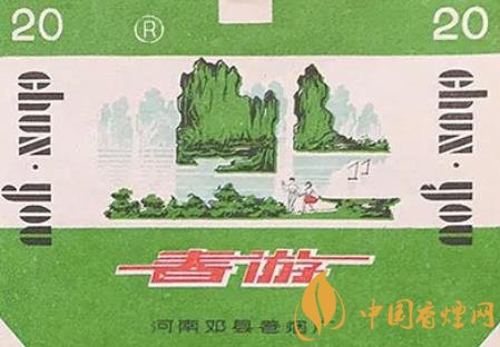 上世紀80年代,河南鄧縣卷煙廠出品的“春游”煙標,主版展現(xiàn)了山巒疊翠、水波蕩漾、帆影點點的迷人風光,在這美景中,兩個人手牽著手走在綠草如茵的岸邊,其中一個女孩身穿紅裙,為滿目的綠增添了一抹亮色,另一個人伸手指著前方,似乎正在指引伙伴欣賞這美麗的湖光山色。