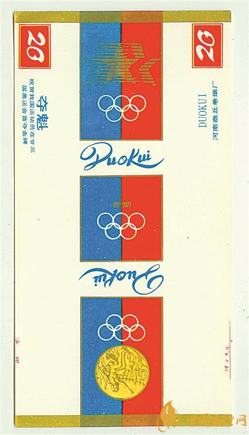 1984年,在美國洛杉磯舉行的第23屆夏季奧運(yùn)會上,我國射擊運(yùn)動員許海峰實現(xiàn)了我國奧運(yùn)金牌零的突破。為祝賀我國運(yùn)動員取得好成績,上世紀(jì)80年代,河南商丘卷煙廠出品了多個版本的“奪魁”煙標(biāo)。其中一個版本的“奪魁”煙標(biāo)(圖①),圖案采用紅色、藍(lán)色和金色為主要配色,主版圖案為洛杉磯奧運(yùn)會會徽,左側(cè)位置印有“祝賀我國運(yùn)動員在廿三屆奧運(yùn)會首奪金牌”字樣,副版上印有奧運(yùn)會金牌圖案和奧運(yùn)五環(huán)標(biāo)志。同時期,山東兗州卷煙廠出品了“五洲”煙標(biāo),主、副版圖案分別為第23屆夏季奧運(yùn)會會徽和奧運(yùn)五環(huán)標(biāo)志。